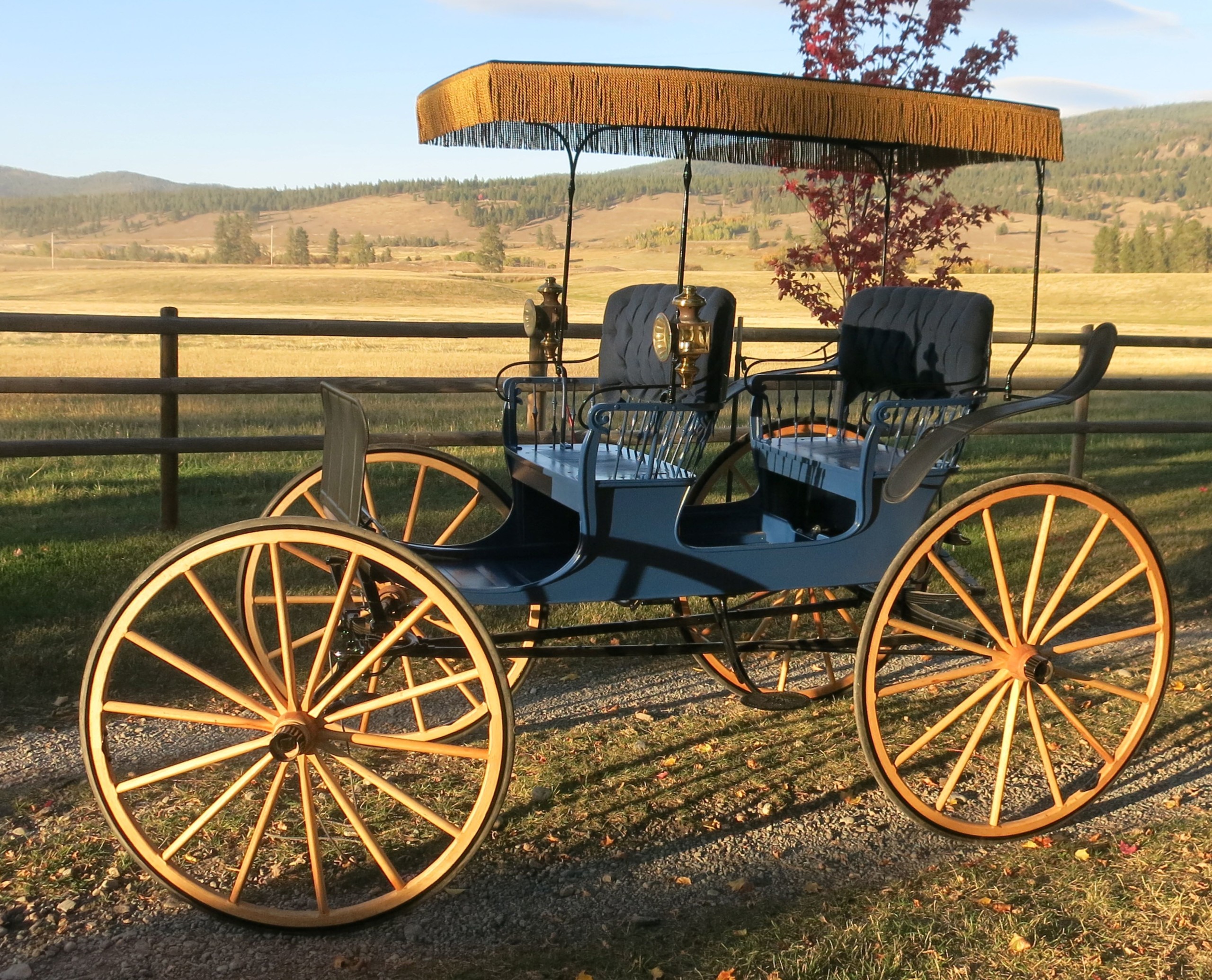 Jim’s late wife, Donna (Racine) Pomajevich ’63, shared in Jim’s love for his collection. Donna’s favorite vehicle was the Brunswick Surrey (pictured below), a beautifully restored blue and gold carriage decorated with fringe and ornate upholstery. Restoration was initially begun by the late Doug Thamert, but Jim acquired it upon Thamert’s passing. To Donna’s delight, Jim and his son Jason painstakingly restored it with countless hours of sanding and painting.