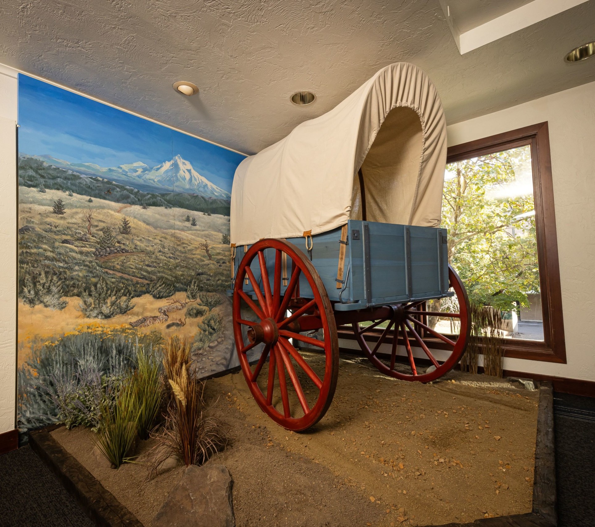 With help from Bushnell Vice President Gene De Young, Jim and his son Jason worked to complete the “Bushnell Wagon” in time for installation in October of 2024, just as the University celebrated the completion of the Venture Forward capital campaign. In order to complement the wagon vignette, a group of talented artists from the Pacific Rim Art Guild painted a geographically and environmentally accurate mural of the terrain and scenery of the section of the Oregon Trail that James Bushnell traveled on his way towards the Willamette Valley. The beautiful tribute to the pioneering vision and faith of James Bushnell lives on permanently in the lobby outside the Ross Evans Memorial Chapel for all campus visitors to see.
